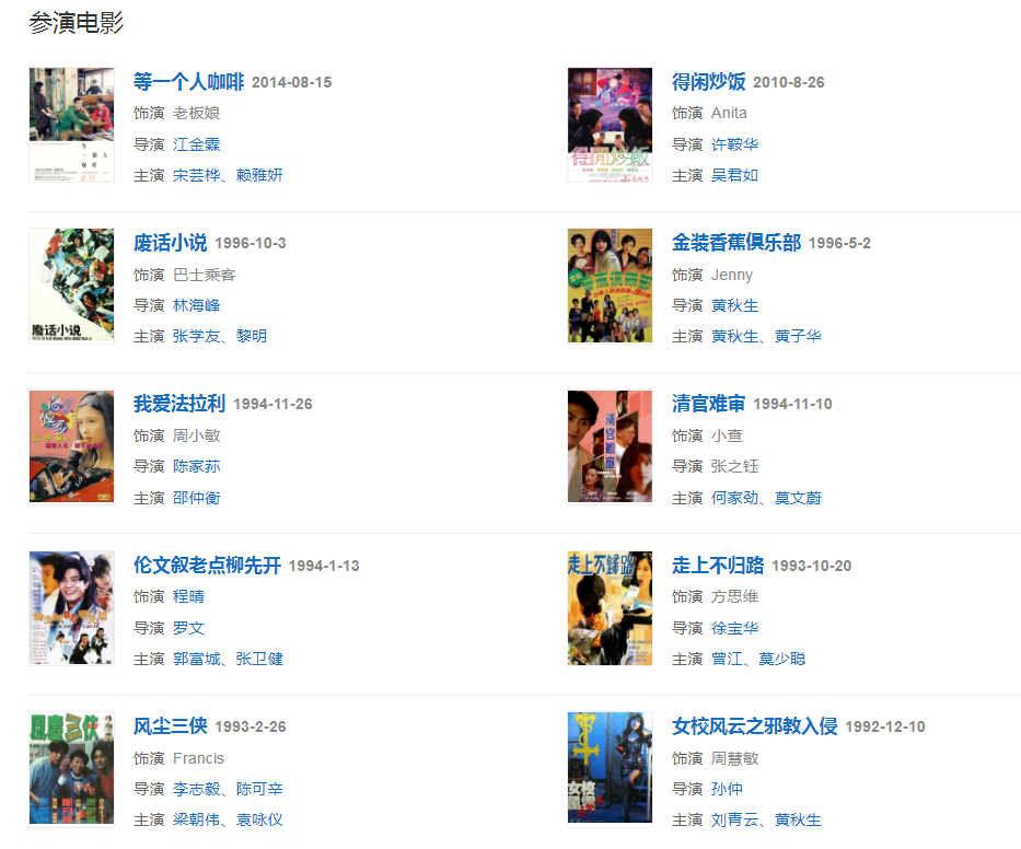 代表作品:天荒愛未老、最愛、癡心換情深、自作多情、流言、三人世界、天神劍女、大時代主要成就:第8屆香港電影金像獎最佳新演員提名