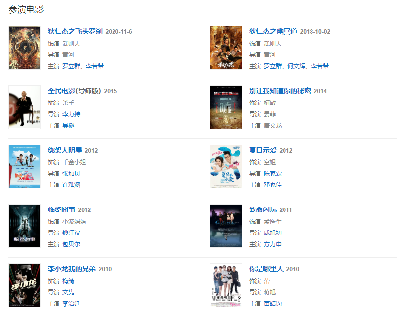 2020年11月6日,特別出演的動作奇幻電影《狄仁杰之飛頭羅剎》在優(yōu)酷上線,在片中飾演女皇武則天。