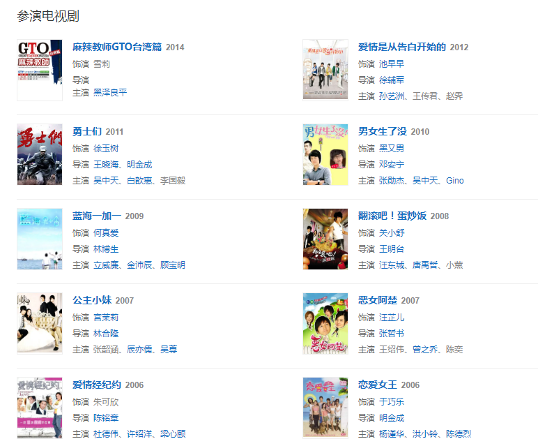 代表作品:梁山伯與茱麗葉、愛的城堡、不要不要、話說夏娃、翻滾吧,蛋炒飯、愛情是從告白開始的