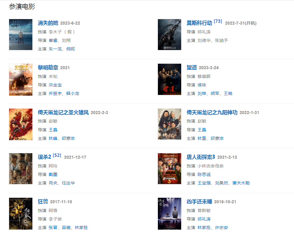 2023年3月24日,領(lǐng)銜主演的電影《望道》上映,在片中飾演了《共產(chǎn)黨宣言》第一個中文全譯本翻譯者陳望道先生的妻子蔡慕暉;6月22日,領(lǐng)銜主演的懸疑犯罪電影《消失的她》全國上映,在片中飾演假妻李木子。
