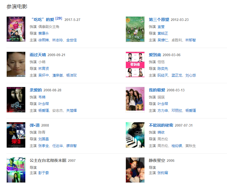 2007年,她憑借在周杰倫自導自演的青春片《不能說的秘密》中飾演女二號晴依獲得四十四屆臺灣金馬獎最佳女配角提名  。