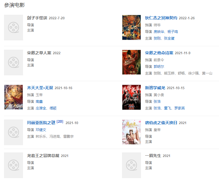 2022年,出演由房映華、楊子鳴聯(lián)合執(zhí)導(dǎo)的古裝探案電影《狄仁杰之冥神契約》,飾演師爺。