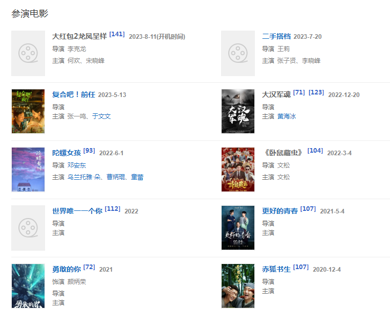 代表作品:情義無價、京城四少、日正當中、明宮謎案、大當家、那年花開月正圓、西虹市首富、都挺好、辣媽正傳